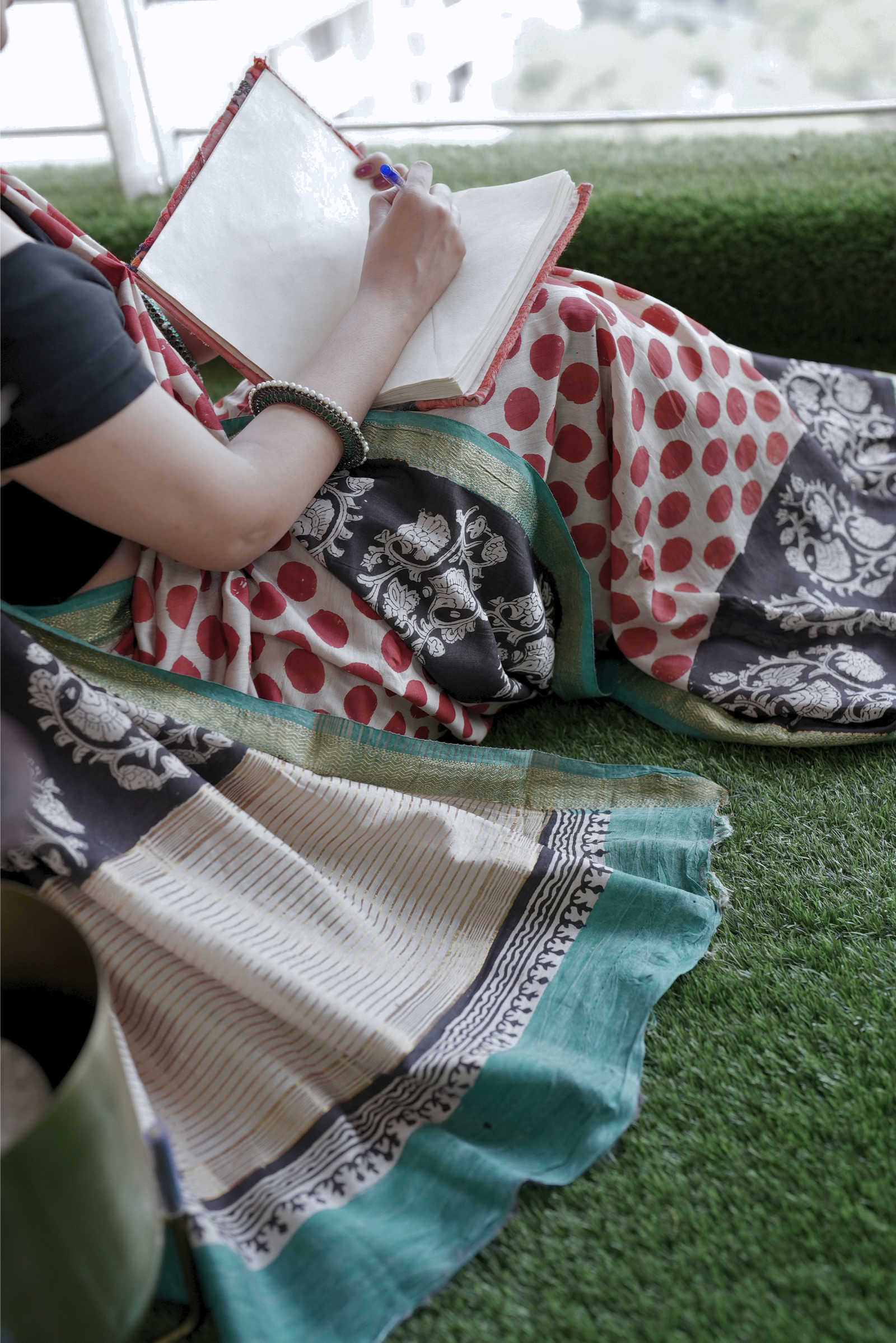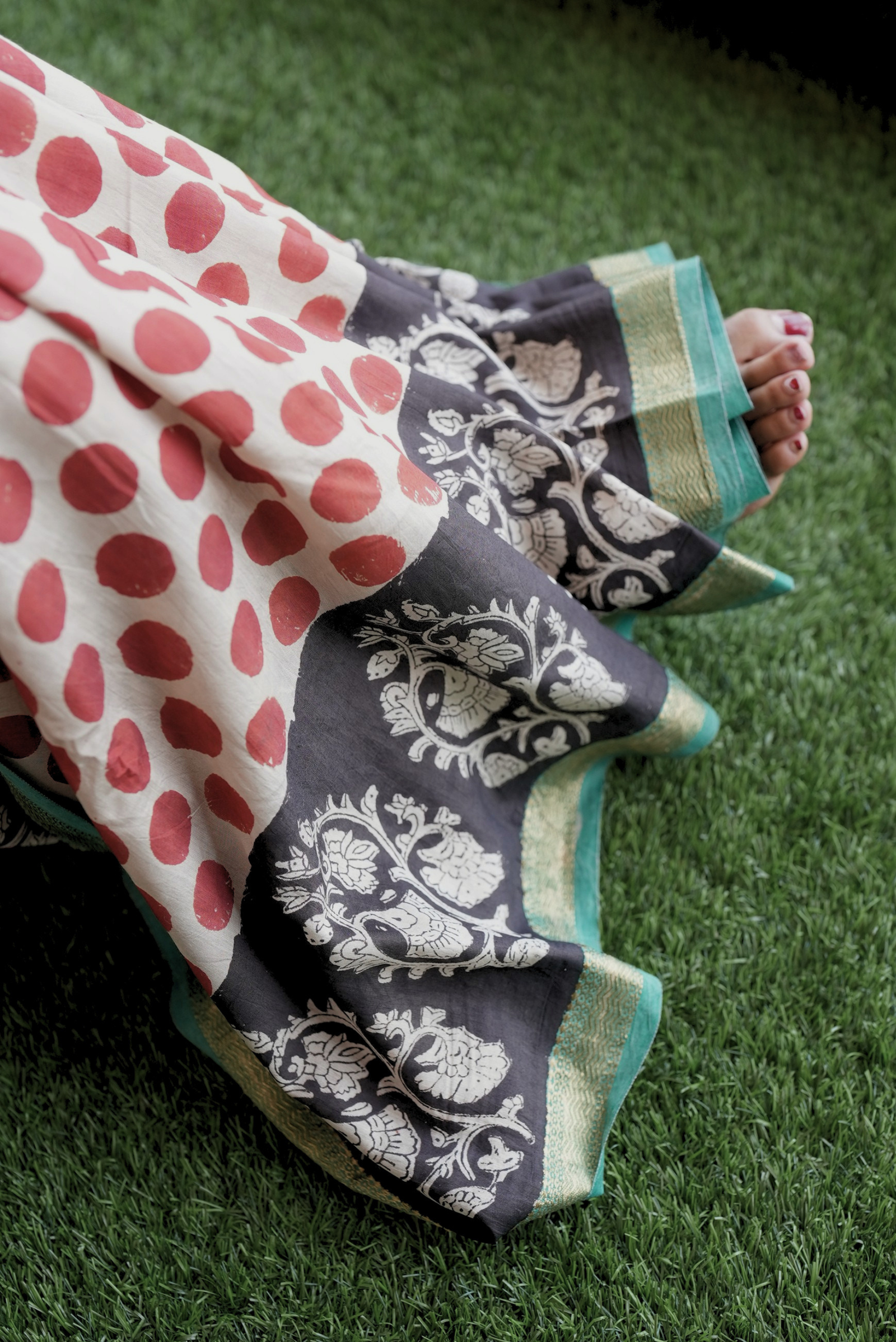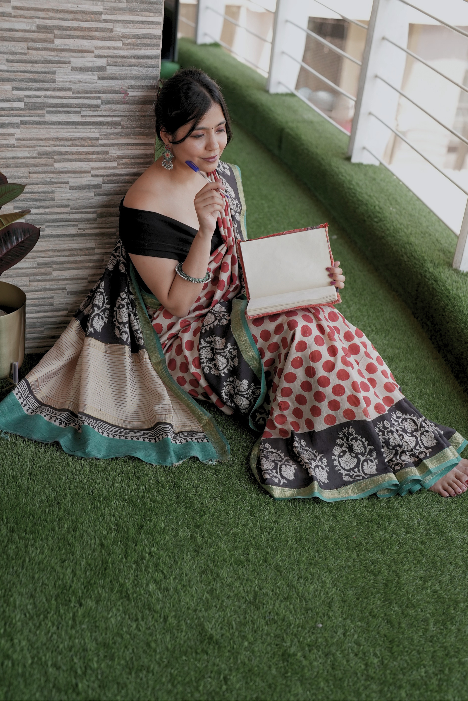 The Cherry Polkaplay Saree brings a fun twist to classic polka vibes. Set on a rich red base, the dotted bagru prints add just the right amount of drama while still keeping it easy and wearable.