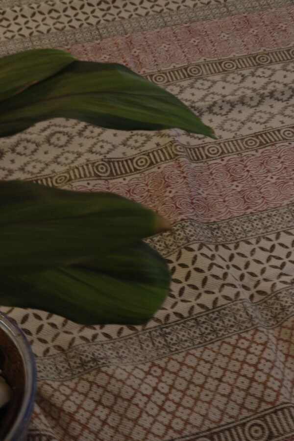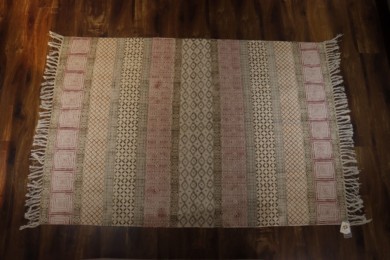A nod to earthy elegance, this 4ft x 6ft cotton blend kaleen is hand block printed in mustard and red, set against a soft beige palette.