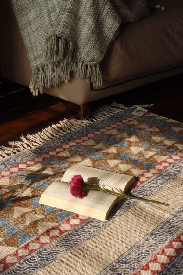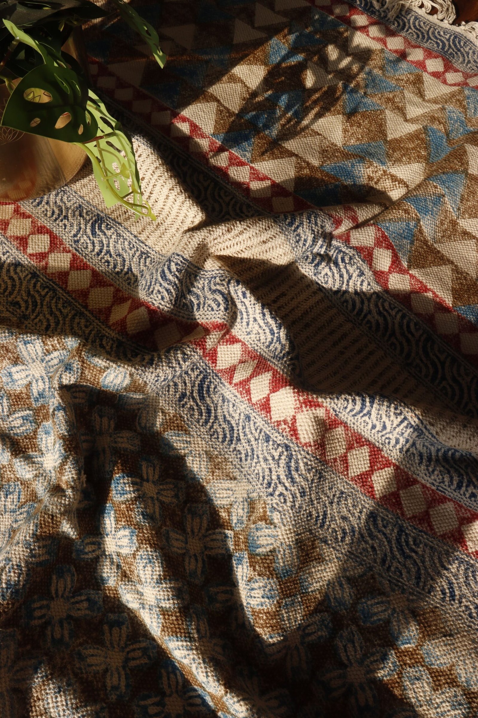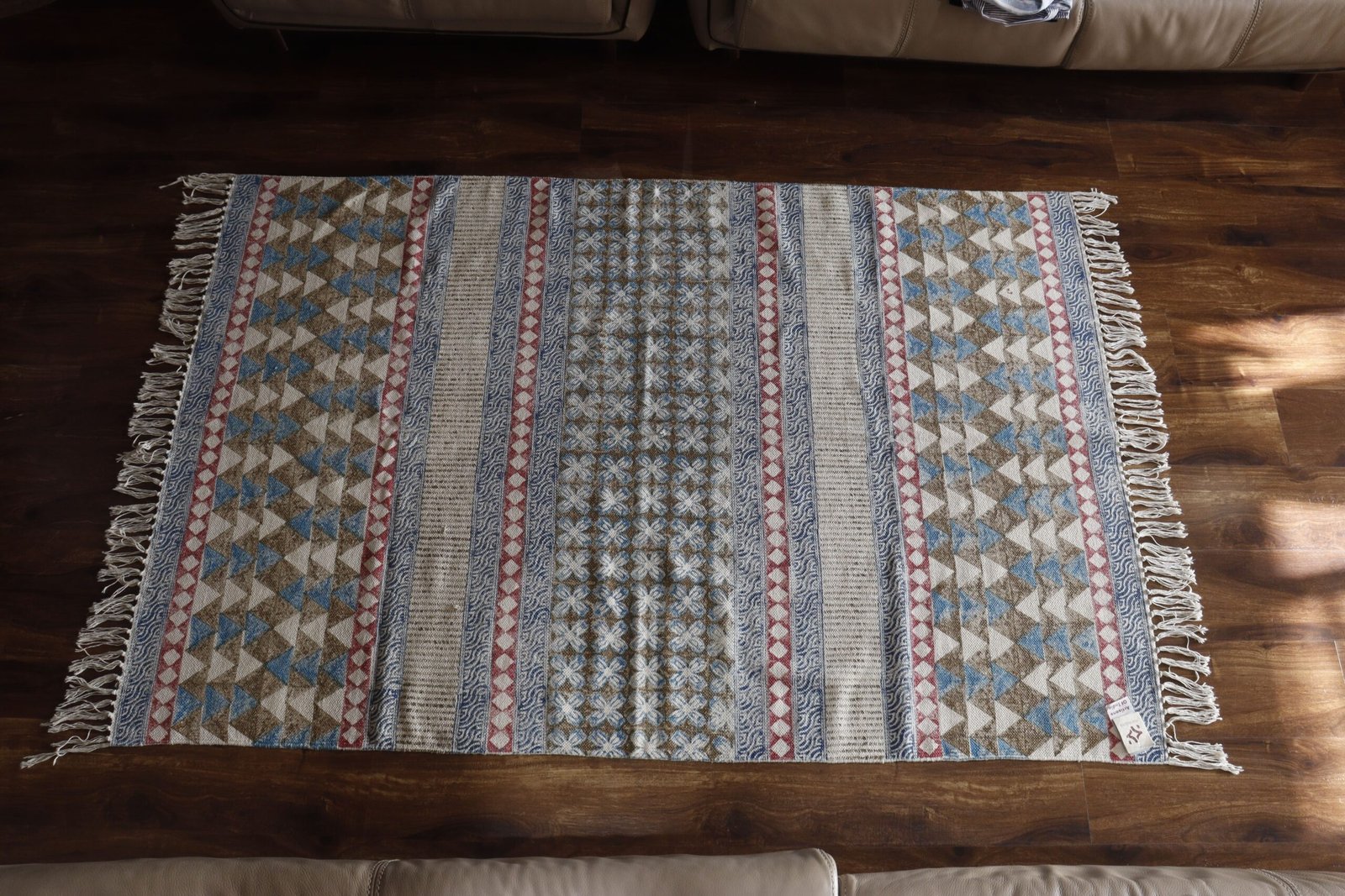 Nostalgic yet timeless — this 4ft x 6ft cotton blend kaleen features an all-over horizontal block print in classic blue and red tones.
