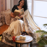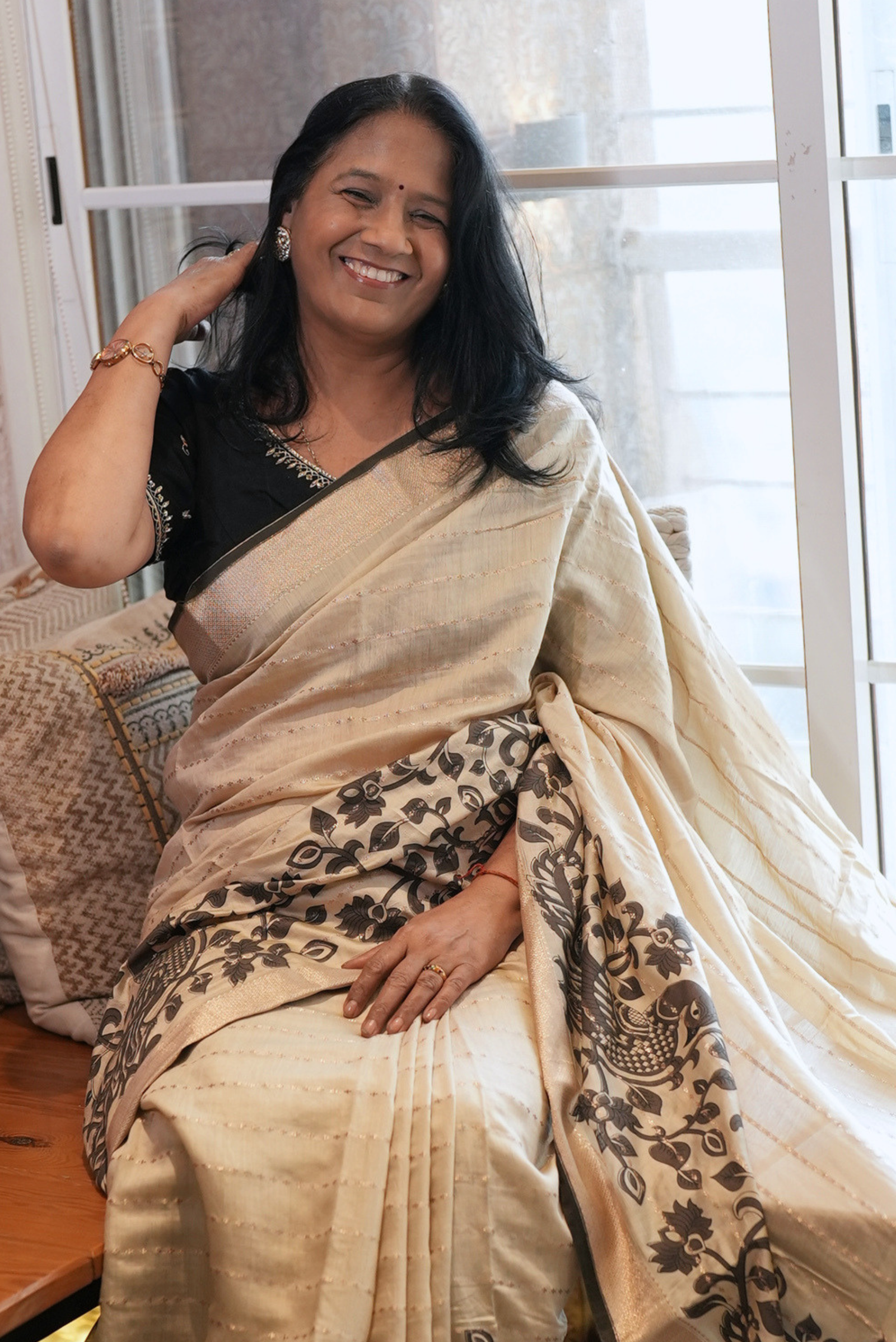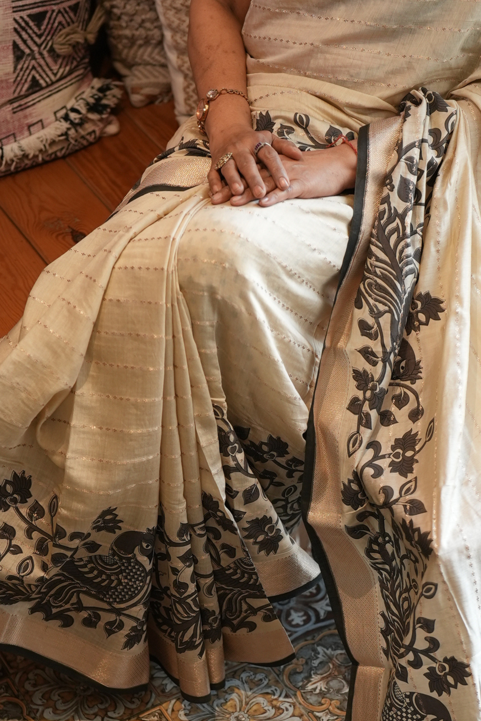 Soft cream tones paired with deeper floral prints give this saree a slightly richer, more detailed look. The contrast border and intricate motifs add depth, while the subtle sheen in the fabric brings in a quiet hint of elegance. Something you can wear when you want a polished look that still feels easy and comfortable. Made in a lightweight fabric, it drapes smoothly and carries a gentle structure that holds its shape well