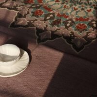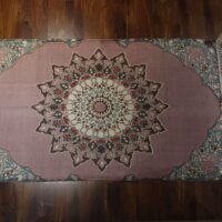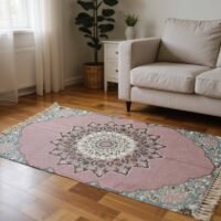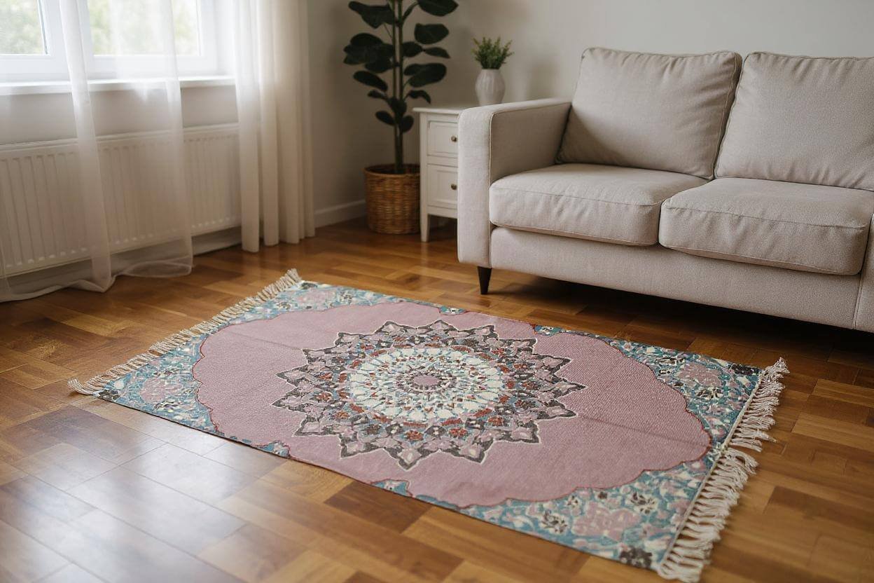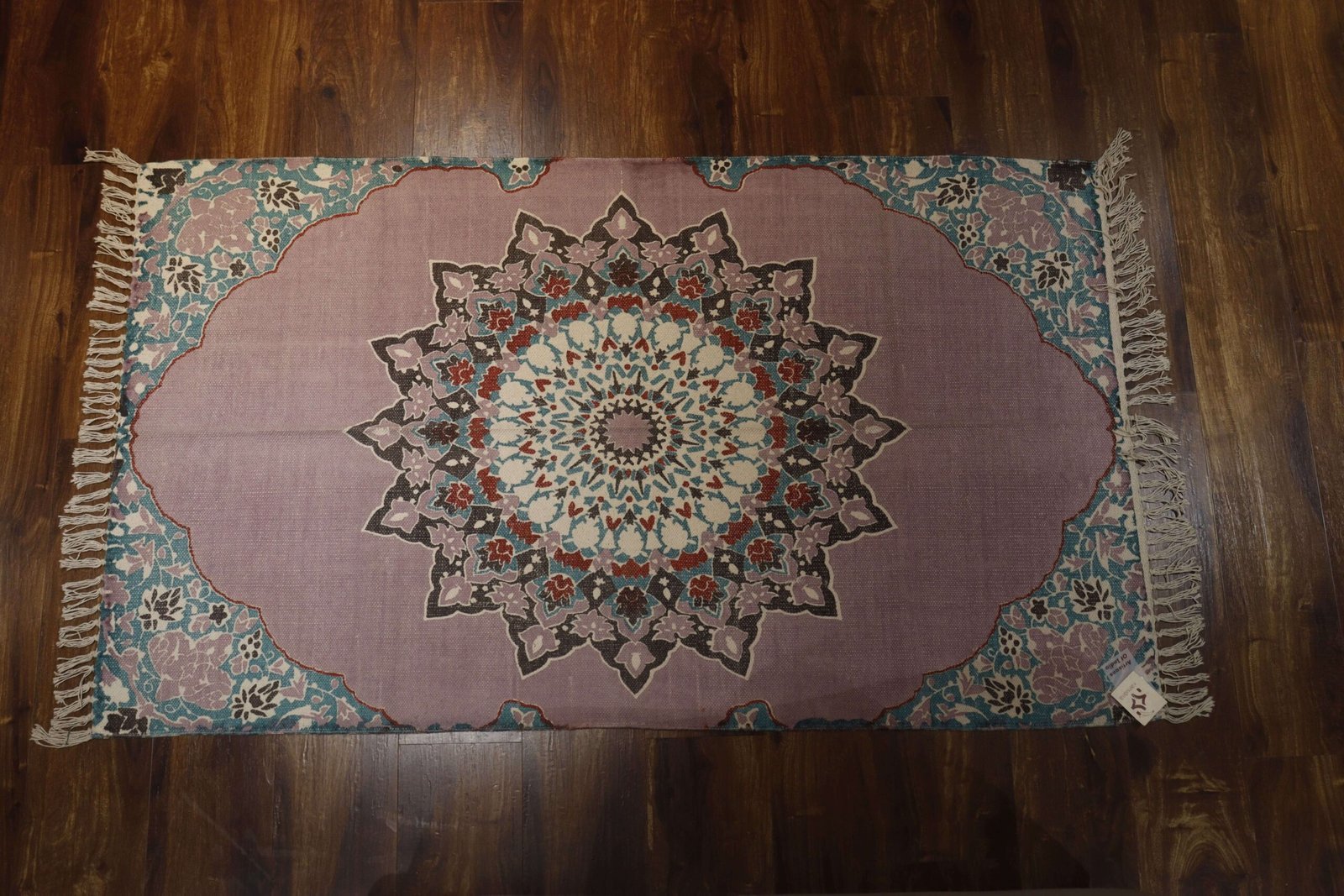 Where softness meets story — this Kashmiri-inspired kaleen features a soothing lavender base accented with intricate red prints, drawing from floral and paisley heritage patterns.