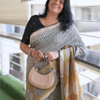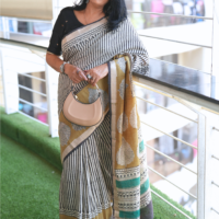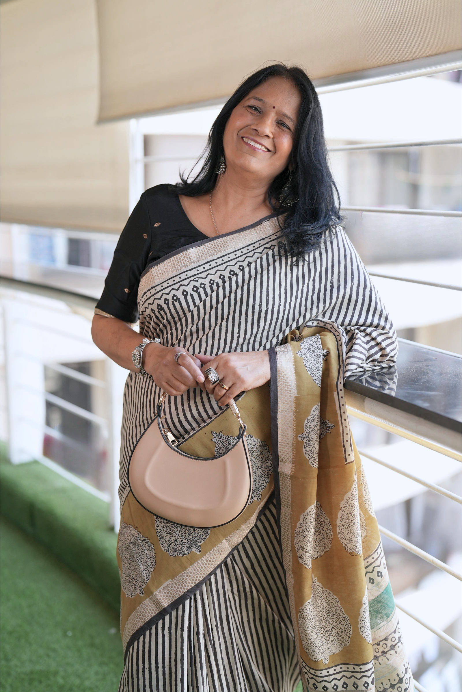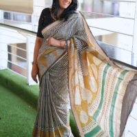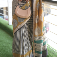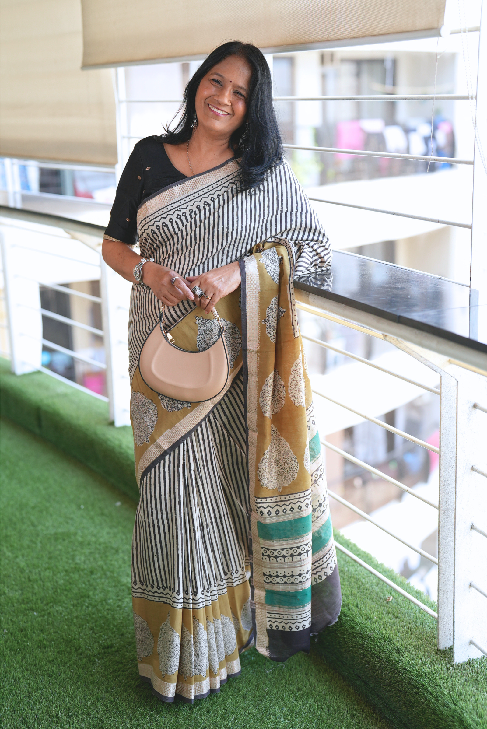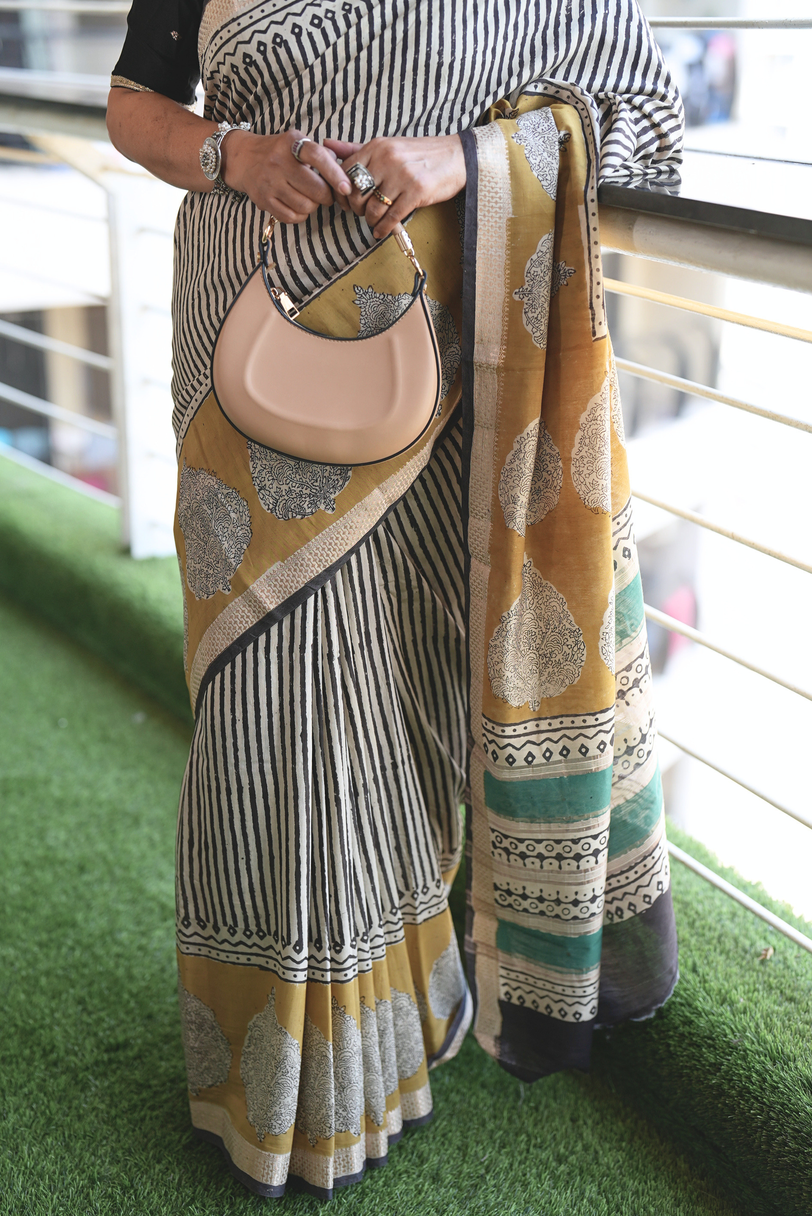 The Yellow Stripecrush Saree mixes classic lines with bold Bagru motifs for a look that feels fresh and a little different. The warm yellow tones add brightness, while the contrast patterns keep things interesting from every angle.